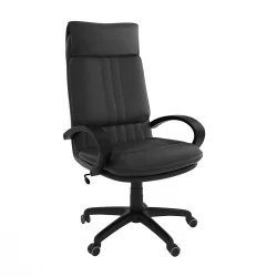 Assise et dossier rembourrés en mousse souple avec couche de dacron. Revêtement en simili cuir ou tissu. Accoudoirs fixe en polypropylène couleur noir. Mécanisme tournant, roulant, réglable en hauteur et en inclinaison. Structure étoilée à 05 branches en polypropylène couleur noir avec 05 roulettes tournantes roulantes à double galets même matière.