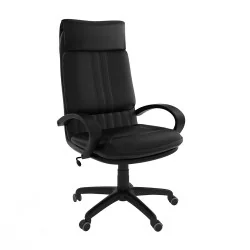 Assise et dossier rembourrés en mousse souple avec couche de dacron. Revêtement en simili cuir ou tissu. Accoudoirs fixe en polypropylène couleur noir. Mécanisme tournant, roulant, réglable en hauteur et en inclinaison. Structure étoilée à 05 branches en polypropylène couleur noir avec 05 roulettes tournantes roulantes à double galets même matière.