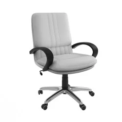 Assise et dossier rembourrés en mousse souple avec couche de dacron. Revêtement en simili cuir ou tissu. Accoudoirs fixe en polypropylène couleur noir. Mécanisme tournant, roulant, réglable en hauteur et en inclinaison. Structure étoilée à 05 branches en métal couleur chromé avec 05 roulettes tournantes roulantes à double galets même matière.