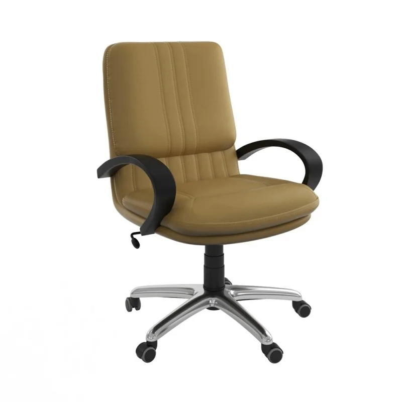 Assise et dossier rembourrés en mousse souple avec couche de dacron. Revêtement en simili cuir ou tissu. Accoudoirs fixe en polypropylène couleur noir. Mécanisme tournant, roulant, réglable en hauteur et en inclinaison. Structure étoilée à 05 branches en métal couleur chromé avec 05 roulettes tournantes roulantes à double galets même matière.