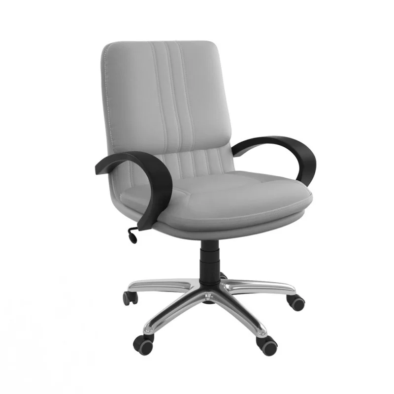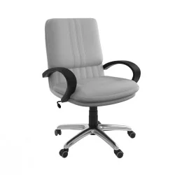 Assise et dossier rembourrés en mousse souple avec couche de dacron. Revêtement en simili cuir ou tissu. Accoudoirs fixe en polypropylène couleur noir. Mécanisme tournant, roulant, réglable en hauteur et en inclinaison. Structure étoilée à 05 branches en métal couleur chromé avec 05 roulettes tournantes roulantes à double galets même matière.