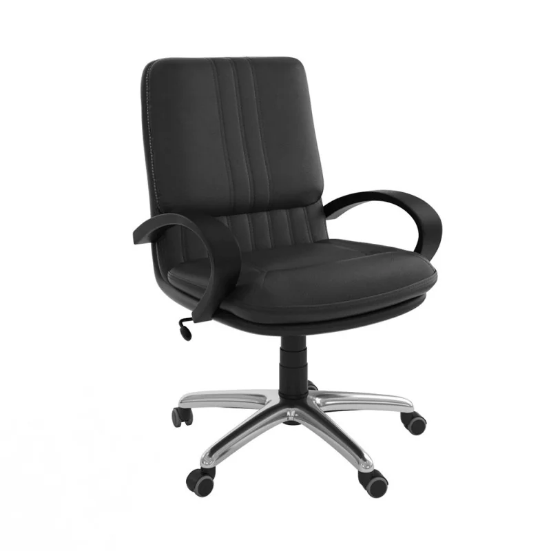 Assise et dossier rembourrés en mousse souple avec couche de dacron. Revêtement en simili cuir ou tissu. Accoudoirs fixe en polypropylène couleur noir. Mécanisme tournant, roulant, réglable en hauteur et en inclinaison. Structure étoilée à 05 branches en métal couleur chromé avec 05 roulettes tournantes roulantes à double galets même matière.
