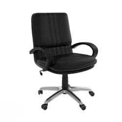 Assise et dossier rembourrés en mousse souple avec couche de dacron. Revêtement en simili cuir ou tissu. Accoudoirs fixe en polypropylène couleur noir. Mécanisme tournant, roulant, réglable en hauteur et en inclinaison. Structure étoilée à 05 branches en métal couleur chromé avec 05 roulettes tournantes roulantes à double galets même matière.