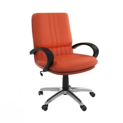 Assise et dossier rembourrés en mousse souple avec couche de dacron. Revêtement en simili cuir ou tissu. Accoudoirs fixe en polypropylène couleur noir. Mécanisme tournant, roulant, réglable en hauteur et en inclinaison. Structure étoilée à 05 branches en métal couleur chromé avec 05 roulettes tournantes roulantes à double galets même matière.