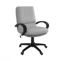 Assise et dossier rembourrés en mousse souple avec couche de dacron. Revêtement en simili cuir ou tissu. Accoudoirs fixe en polypropylène couleur noir. Mécanisme tournant, roulant, réglable en hauteur et en inclinaison. Structure étoilée à 05 branches en polypropylène couleur noir avec 05 roulettes tournantes roulantes à double galets même matière.