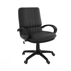 Assise et dossier rembourrés en mousse souple avec couche de dacron. Revêtement en simili cuir ou tissu. Accoudoirs fixe en polypropylène couleur noir. Mécanisme tournant, roulant, réglable en hauteur et en inclinaison. Structure étoilée à 05 branches en polypropylène couleur noir avec 05 roulettes tournantes roulantes à double galets même matière.