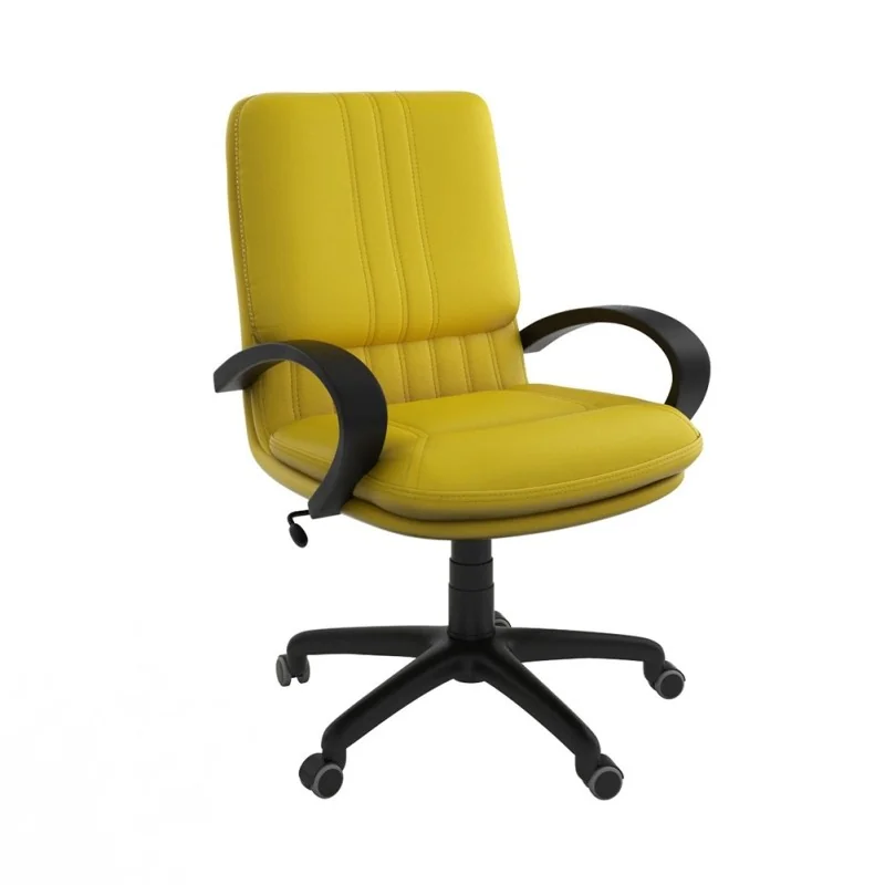 Assise et dossier rembourrés en mousse souple avec couche de dacron. Revêtement en simili cuir ou tissu. Accoudoirs fixe en polypropylène couleur noir. Mécanisme tournant, roulant, réglable en hauteur et en inclinaison. Structure étoilée à 05 branches en polypropylène couleur noir avec 05 roulettes tournantes roulantes à double galets même matière.