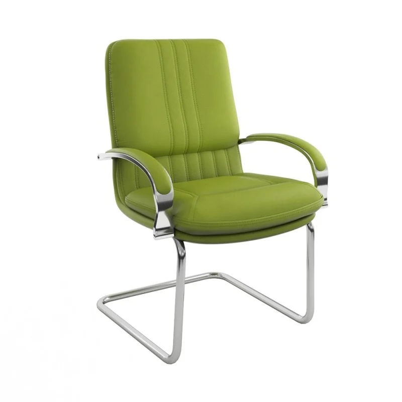 Assise et dossier rembourrés en mousse souple avec couche de dacron. Accoudoirs fixe en métal chromé avec une partie rembourré, tapissé. Revêtement en simili cuir. Structure métallique (luge) chromé avec patins danti-dérapage.