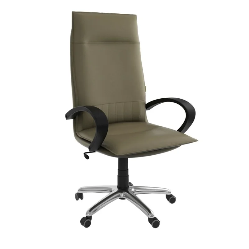 Assise et dossier rembourrés en mousse souple avec couche de dacron. Revêtement en simili cuir. Accoudoirs fixe en Polypropylène couleur noir. Mécanisme tournant, roulant, réglable en hauteur et en inclinaison. Structure étoilée à 05 branches en métal chromé avec 05 roulettes tournantes roulantes à double galets.