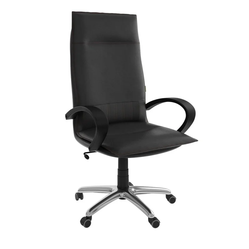 Assise et dossier rembourrés en mousse souple avec couche de dacron. Revêtement en simili cuir. Accoudoirs fixe en Polypropylène couleur noir. Mécanisme tournant, roulant, réglable en hauteur et en inclinaison. Structure étoilée à 05 branches en métal chromé avec 05 roulettes tournantes roulantes à double galets.