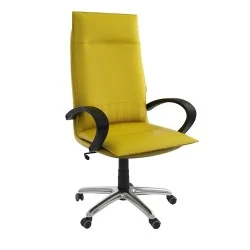 Assise et dossier rembourrés en mousse souple avec couche de dacron. Revêtement en simili cuir. Accoudoirs fixe en Polypropylène couleur noir. Mécanisme tournant, roulant, réglable en hauteur et en inclinaison. Structure étoilée à 05 branches en métal chromé avec 05 roulettes tournantes roulantes à double galets.