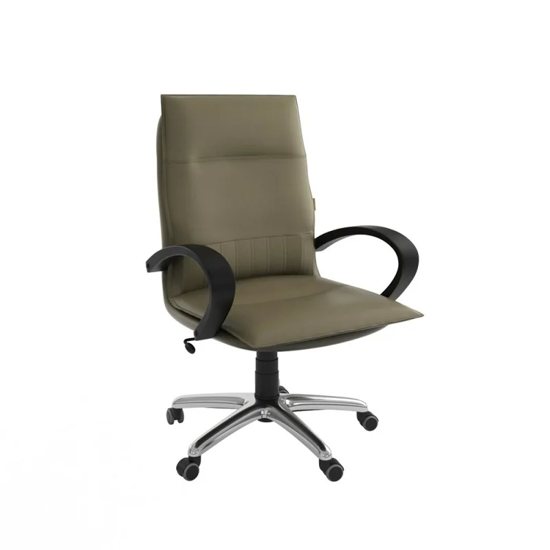 Assise et dossier rembourrés en mousse souple avec couche de dacron. Revêtement en simili cuir. Accoudoirs fixe en Polypropylène couleur noir. Mécanisme tournant, roulant, réglable en hauteur et en inclinaison. Structure étoilée à 05 branches en métal chromé avec 05 roulettes tournantes roulantes à double galets.