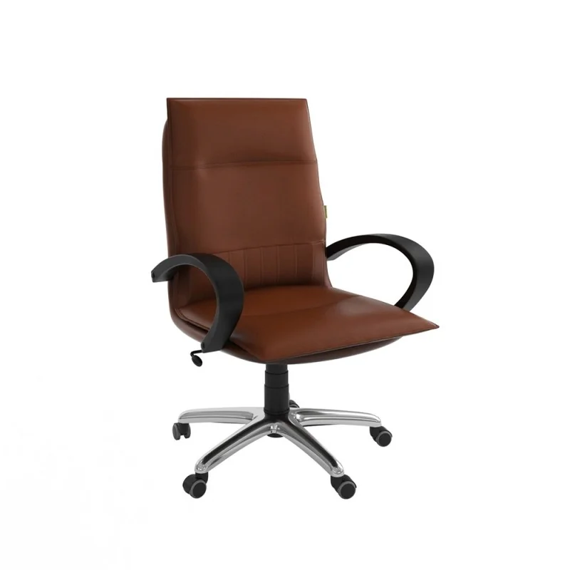 Assise et dossier rembourrés en mousse souple avec couche de dacron. Revêtement en simili cuir. Accoudoirs fixe en Polypropylène couleur noir. Mécanisme tournant, roulant, réglable en hauteur et en inclinaison. Structure étoilée à 05 branches en métal chromé avec 05 roulettes tournantes roulantes à double galets.