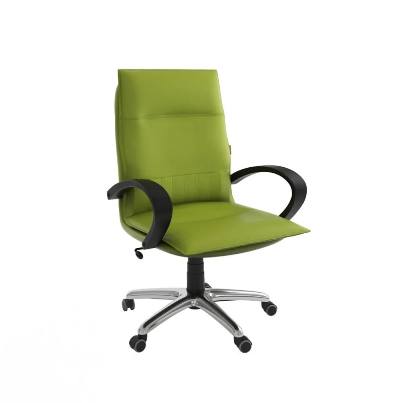 Assise et dossier rembourrés en mousse souple avec couche de dacron. Revêtement en simili cuir. Accoudoirs fixe en Polypropylène couleur noir. Mécanisme tournant, roulant, réglable en hauteur et en inclinaison. Structure étoilée à 05 branches en métal chromé avec 05 roulettes tournantes roulantes à double galets.