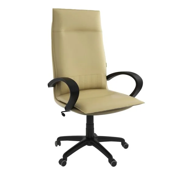 Assise et dossier rembourrés en mousse souple avec couche de dacron. Revêtement en simili cuir. Accoudoirs fixe en Polypropylène couleur noir. Mécanisme tournant, roulant, réglable en hauteur et en inclinaison. Structure étoilée à 05 branches en Polypropylène couleur noir avec 05 roulettes tournantes roulantes à double galets même matière.