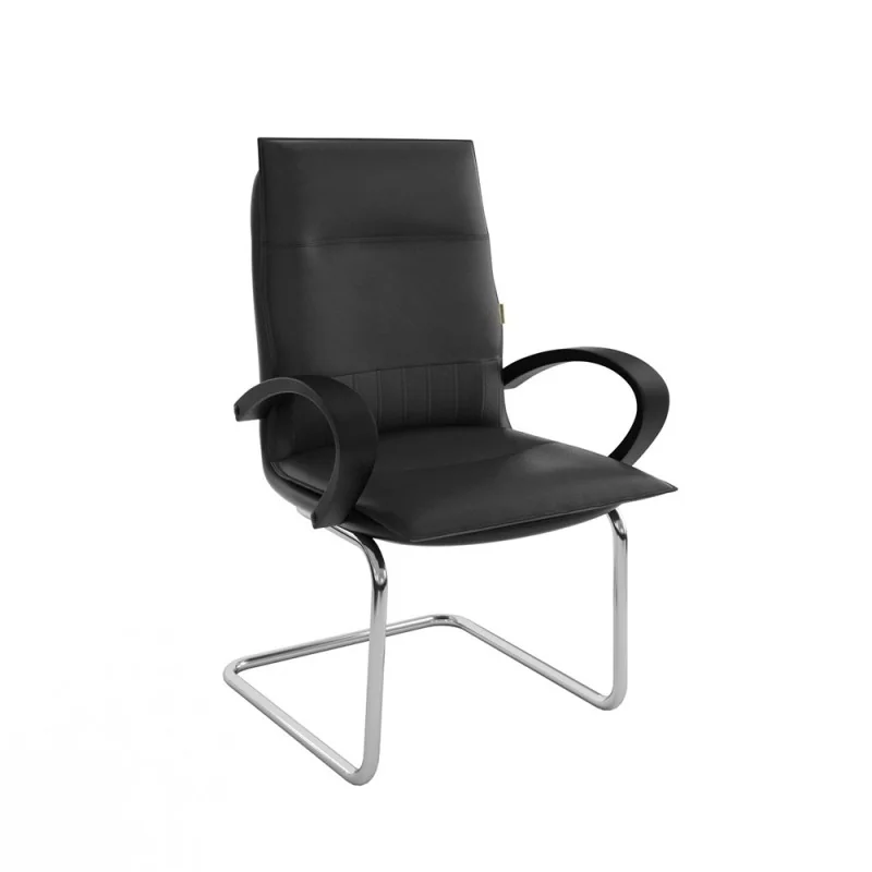Assise et dossier rembourrés en mousse souple avec couche de dacron. Revêtement en simili cuir. Accoudoirs fixe en Polypropylène couleur noir. Structure métallique (luge) chromé avec patins danti-dérapage.