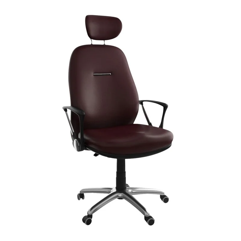 Assise et dossier en mousse injectée. Revêtement en simili cuir. Repose tête en mousse injectée revêtu en simili cuir. Accoudoirs en acier chromé et Polypropylène noir. Mécanisme Basculant, tournant, roulant, réglable en hauteur et en inclinaison. Structure étoilée à 05 branches en métal chromé avec 05 roulettes tournantes roulantes à double galets.