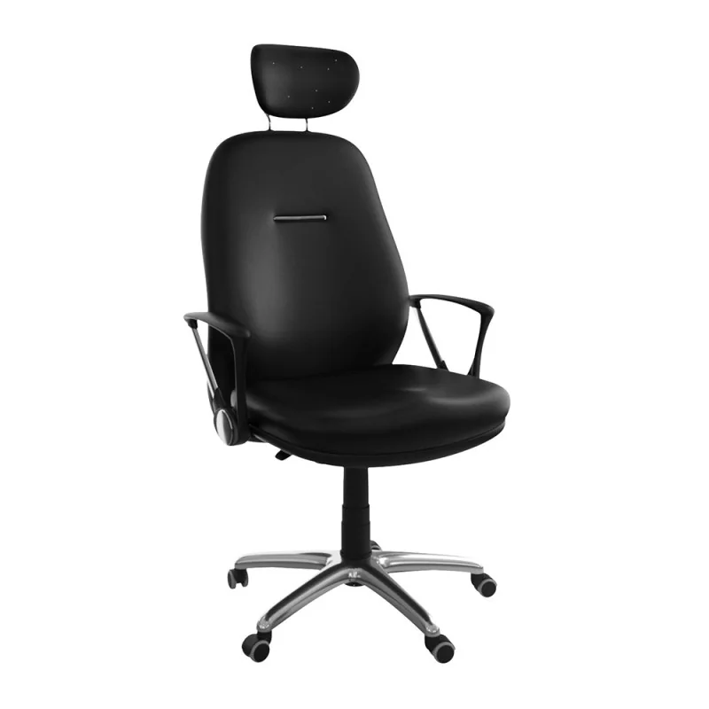Assise et dossier en mousse injectée. Revêtement en simili cuir. Repose tête en mousse injectée revêtu en simili cuir. Accoudoirs en acier chromé et Polypropylène noir. Mécanisme Basculant, tournant, roulant, réglable en hauteur et en inclinaison. Structure étoilée à 05 branches en métal chromé avec 05 roulettes tournantes roulantes à double galets.