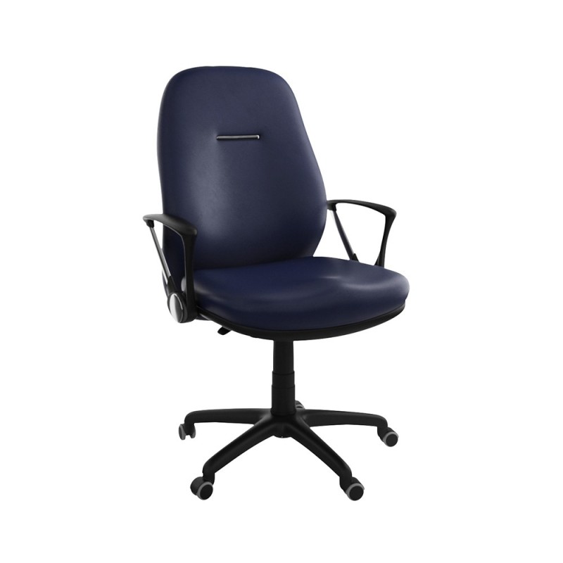 Assise et dossier en mousse injectée. Revêtement en simili cuir. Accoudoirs en acier chromé et Polypropylène noir. Mécanisme Basculant, tournant, roulant, réglable en hauteur et en inclinaison. Structure étoilée à 05 branches en Polypropylène couleur noir avec 05 roulettes tournantes roulantes à double galets.