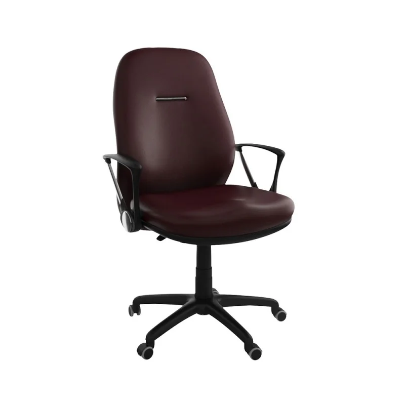 Assise et dossier en mousse injectée. Revêtement en simili cuir. Accoudoirs en acier chromé et Polypropylène noir. Mécanisme Basculant, tournant, roulant, réglable en hauteur et en inclinaison. Structure étoilée à 05 branches en Polypropylène couleur noir avec 05 roulettes tournantes roulantes à double galets.
