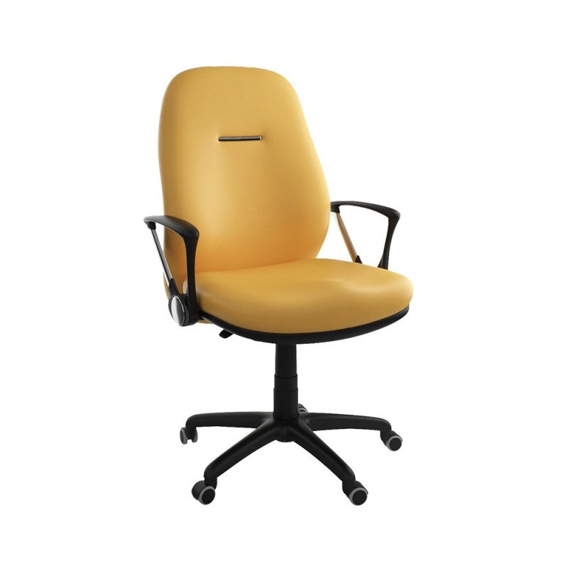 Assise et dossier en mousse injectée. Revêtement en simili cuir. Accoudoirs en acier chromé et Polypropylène noir. Mécanisme Basculant, tournant, roulant, réglable en hauteur et en inclinaison. Structure étoilée à 05 branches en Polypropylène couleur noir avec 05 roulettes tournantes roulantes à double galets.