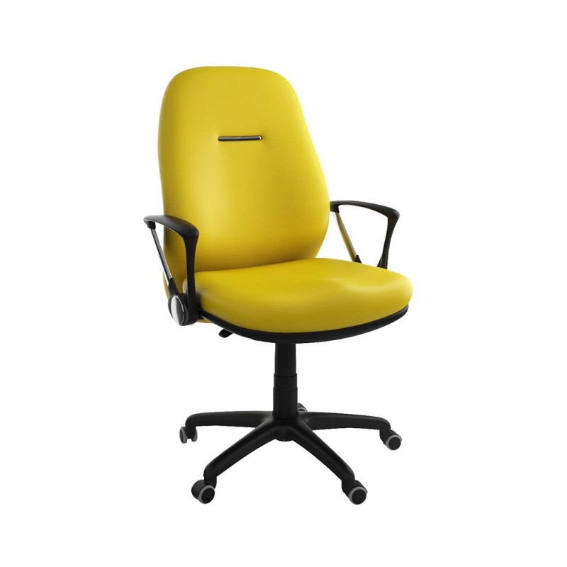 Assise et dossier en mousse injectée. Revêtement en simili cuir. Accoudoirs en acier chromé et Polypropylène noir. Mécanisme Basculant, tournant, roulant, réglable en hauteur et en inclinaison. Structure étoilée à 05 branches en Polypropylène couleur noir avec 05 roulettes tournantes roulantes à double galets.