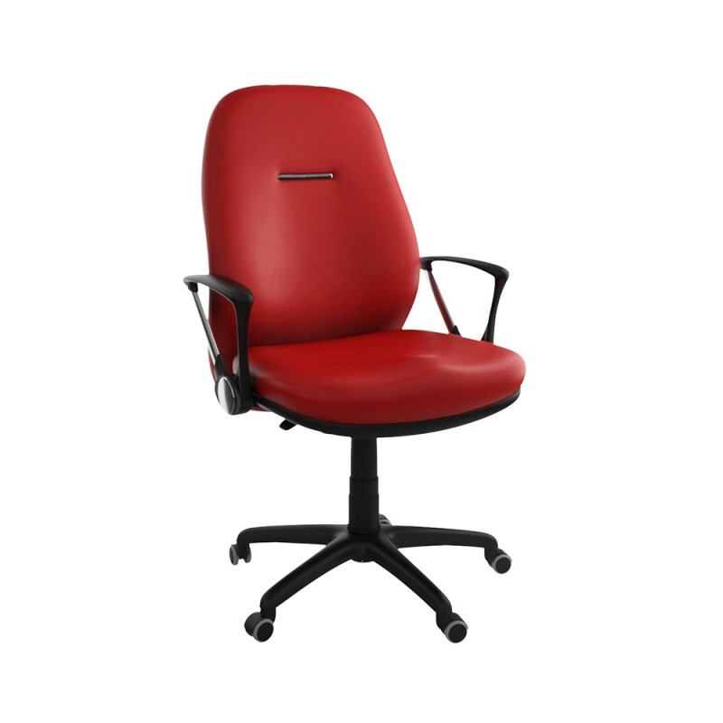 Assise et dossier en mousse injectée. Revêtement en simili cuir. Accoudoirs en acier chromé et Polypropylène noir. Mécanisme Basculant, tournant, roulant, réglable en hauteur et en inclinaison. Structure étoilée à 05 branches en Polypropylène couleur noir avec 05 roulettes tournantes roulantes à double galets.