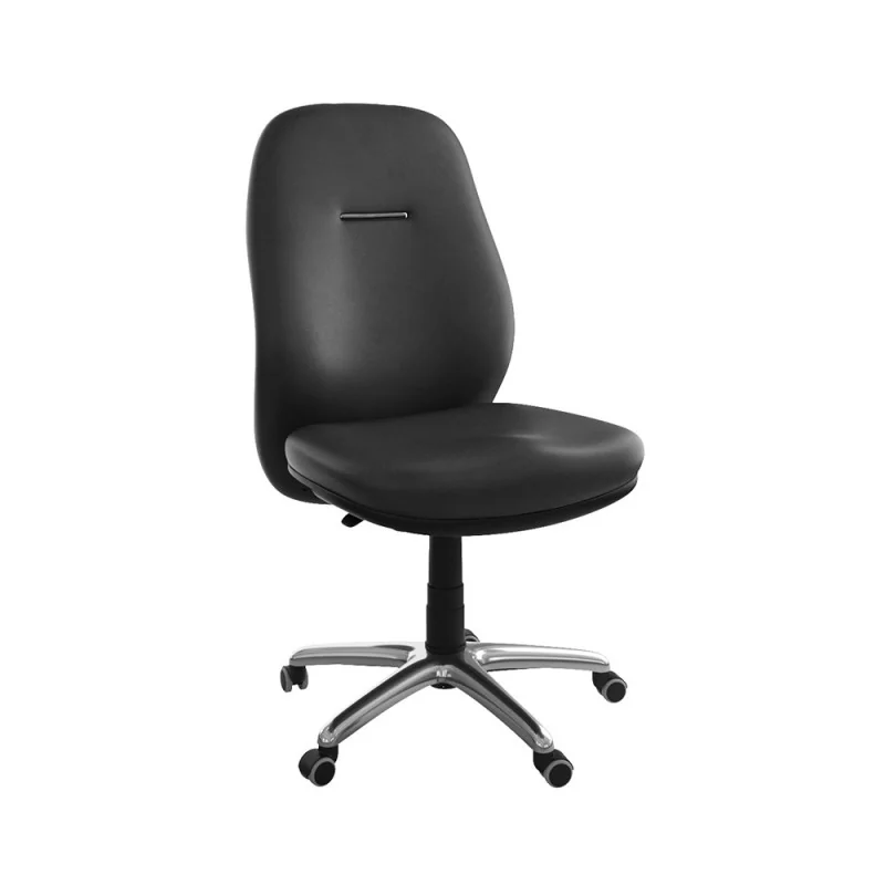 Assise et dossier en mousse injectée. Revêtement en simili cuir. Mécanisme Basculant, tournant, roulant, réglable en hauteur et en inclinaison. Structure étoilée à 05 branches en métal chromé avec 05 roulettes tournantes roulantes à double galets.