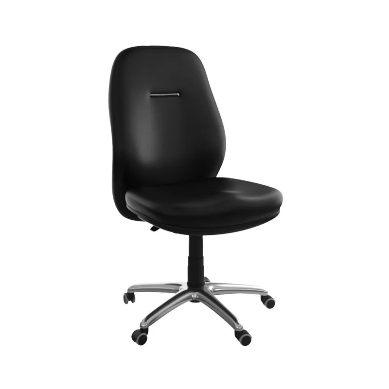Assise et dossier en mousse injectée. Revêtement en simili cuir. Mécanisme Basculant, tournant, roulant, réglable en hauteur et en inclinaison. Structure étoilée à 05 branches en métal chromé avec 05 roulettes tournantes roulantes à double galets.