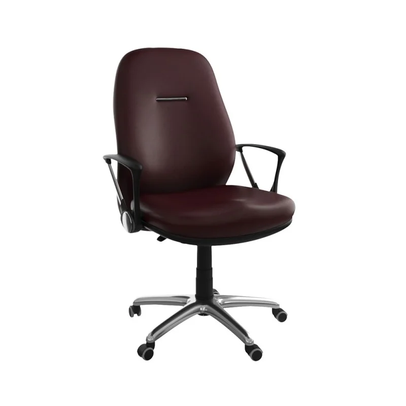 Assise et dossier en mousse injectée. Revêtement en simili cuir. Accoudoirs en acier chromé et Polypropylène noir. Mécanisme Basculant, tournant, roulant, réglable en hauteur et en inclinaison. Structure étoilée à 05 branches en métal chromé avec 05 roulettes tournantes roulantes à double galets.