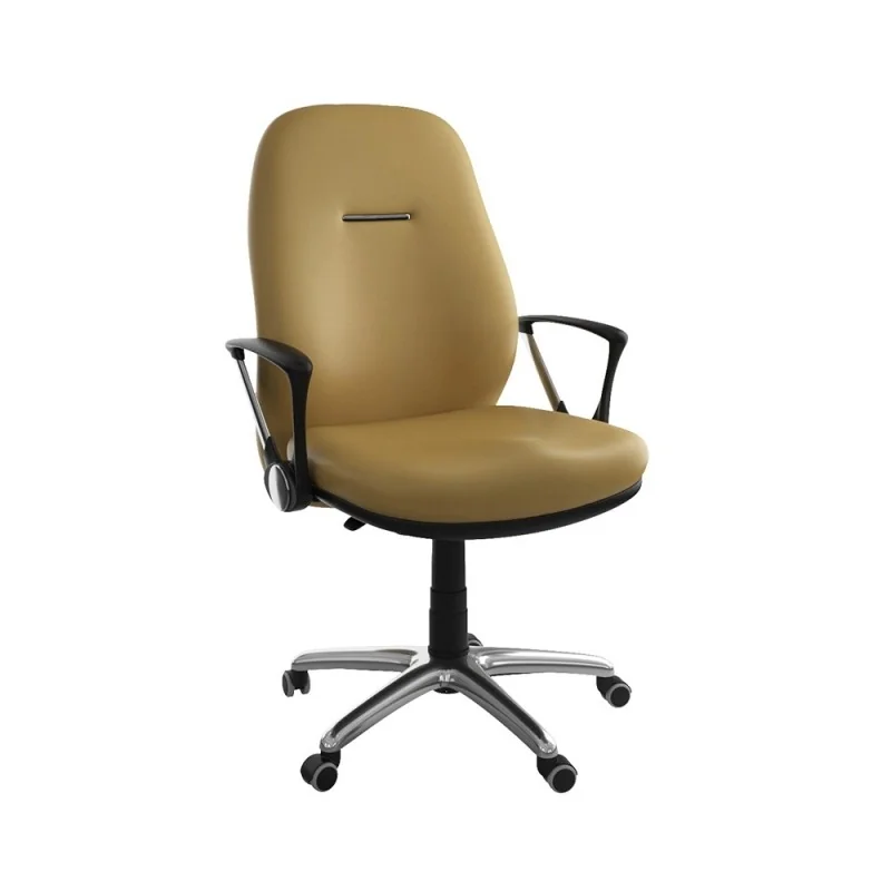 Assise et dossier en mousse injectée. Revêtement en simili cuir. Accoudoirs en acier chromé et Polypropylène noir. Mécanisme Basculant, tournant, roulant, réglable en hauteur et en inclinaison. Structure étoilée à 05 branches en métal chromé avec 05 roulettes tournantes roulantes à double galets.