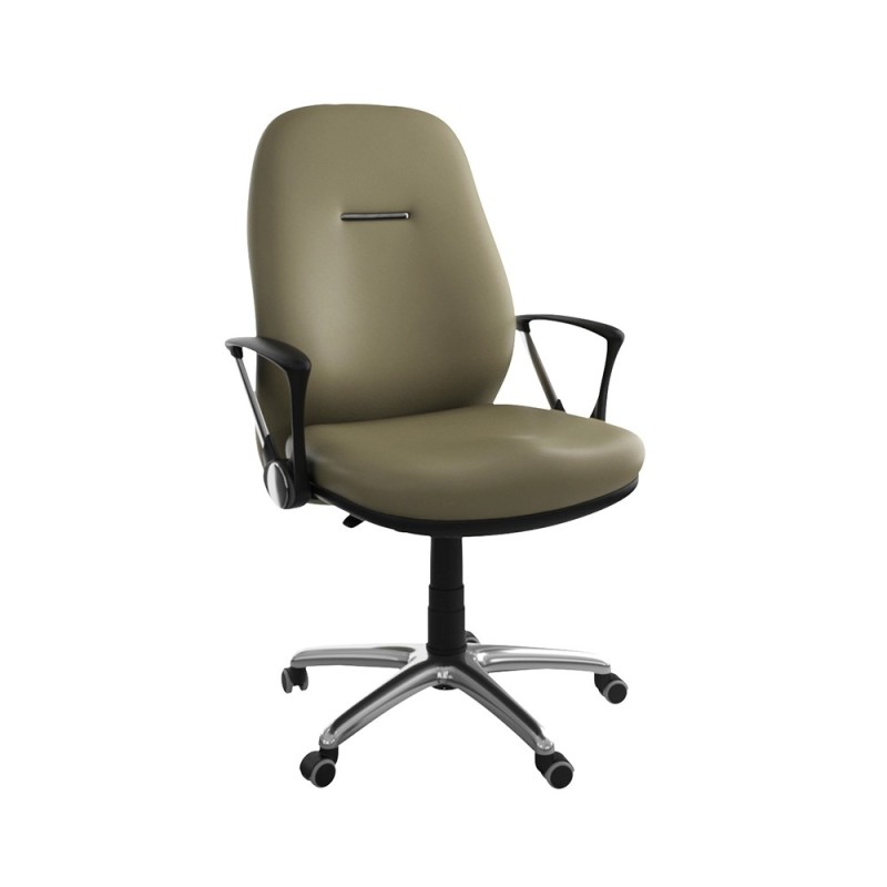Assise et dossier en mousse injectée. Revêtement en simili cuir. Accoudoirs en acier chromé et Polypropylène noir. Mécanisme Basculant, tournant, roulant, réglable en hauteur et en inclinaison. Structure étoilée à 05 branches en métal chromé avec 05 roulettes tournantes roulantes à double galets.