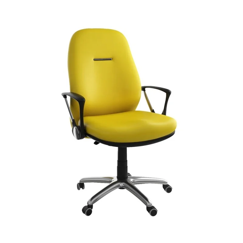 Assise et dossier en mousse injectée. Revêtement en simili cuir. Accoudoirs en acier chromé et Polypropylène noir. Mécanisme Basculant, tournant, roulant, réglable en hauteur et en inclinaison. Structure étoilée à 05 branches en métal chromé avec 05 roulettes tournantes roulantes à double galets.