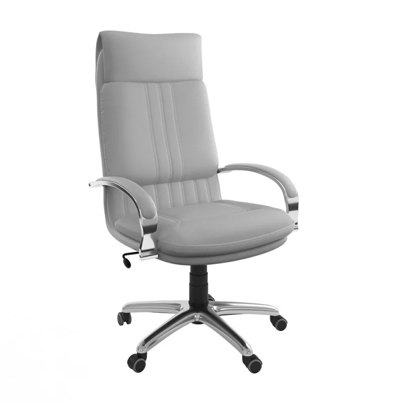 Assise et dossier rembourrés en mousse souple avec couche de dacron. Revêtement en simili cuir ou tissu. Accoudoirs fixe en métal chromé avec une partie rembourré, tapissé. Mécanisme tournant, roulant, réglable en hauteur et en inclinaison. Structure étoilée à 05 branches en métal couleur chromé avec 05 roulettes tournantes roulantes à double galets même matière.