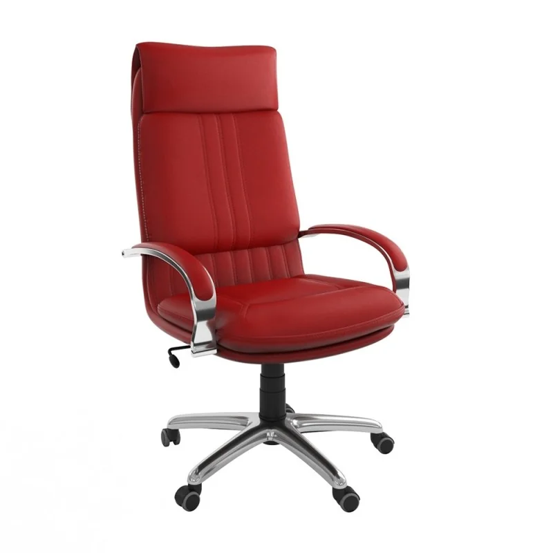 Assise et dossier rembourrés en mousse souple avec couche de dacron. Revêtement en simili cuir ou tissu. Accoudoirs fixe en métal chromé avec une partie rembourré, tapissé. Mécanisme tournant, roulant, réglable en hauteur et en inclinaison. Structure étoilée à 05 branches en métal couleur chromé avec 05 roulettes tournantes roulantes à double galets même matière.