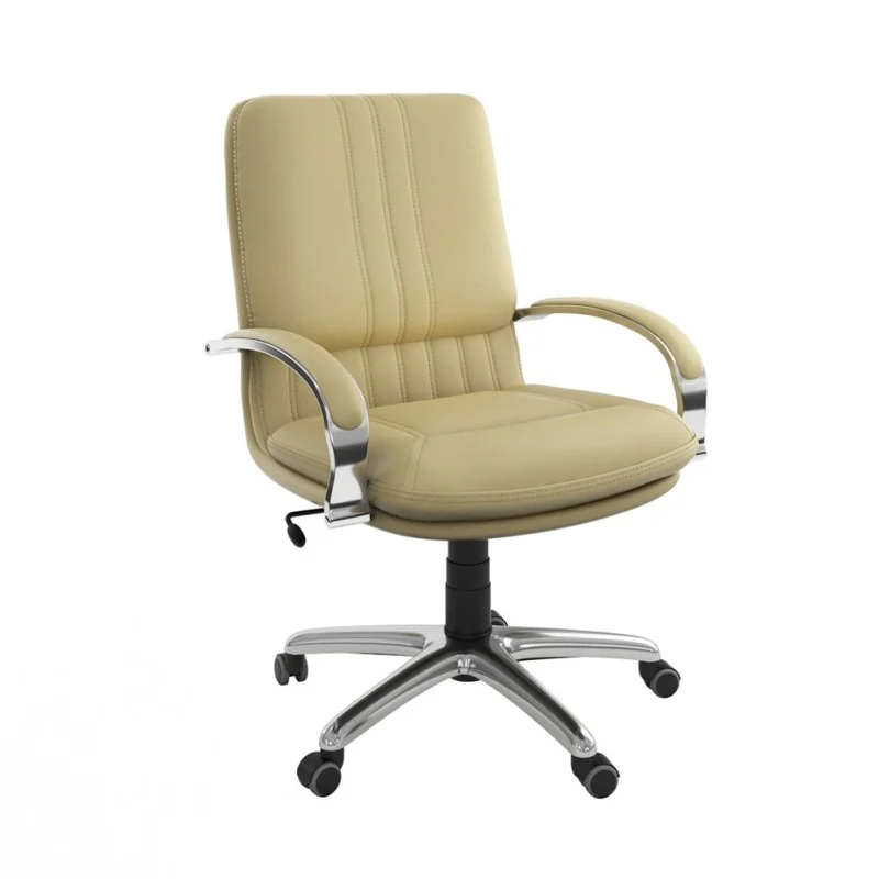 Assise et dossier rembourrés en mousse souple avec couche de dacron. Revêtement en simili cuir ou tissu. Accoudoirs fixe en métal chromé avec une partie rembourré, tapissé. Mécanisme tournant, roulant, réglable en hauteur et en inclinaison. Structure étoilée à 05 branches en métal couleur chromé avec 05 roulettes tournantes roulantes à double galets même matière.