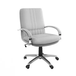Assise et dossier rembourrés en mousse souple avec couche de dacron. Revêtement en simili cuir ou tissu. Accoudoirs fixe en métal chromé avec une partie rembourré, tapissé. Mécanisme tournant, roulant, réglable en hauteur et en inclinaison. Structure étoilée à 05 branches en métal couleur chromé avec 05 roulettes tournantes roulantes à double galets même matière.