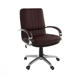 Assise et dossier rembourrés en mousse souple avec couche de dacron. Revêtement en simili cuir ou tissu. Accoudoirs fixe en métal chromé avec une partie rembourré, tapissé. Mécanisme tournant, roulant, réglable en hauteur et en inclinaison. Structure étoilée à 05 branches en métal couleur chromé avec 05 roulettes tournantes roulantes à double galets même matière.