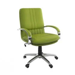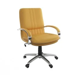 Assise et dossier rembourrés en mousse souple avec couche de dacron. Revêtement en simili cuir ou tissu. Accoudoirs fixe en métal chromé avec une partie rembourré, tapissé. Mécanisme tournant, roulant, réglable en hauteur et en inclinaison. Structure étoilée à 05 branches en métal couleur chromé avec 05 roulettes tournantes roulantes à double galets même matière.