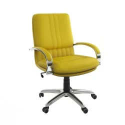 Assise et dossier rembourrés en mousse souple avec couche de dacron. Revêtement en simili cuir ou tissu. Accoudoirs fixe en métal chromé avec une partie rembourré, tapissé. Mécanisme tournant, roulant, réglable en hauteur et en inclinaison. Structure étoilée à 05 branches en métal couleur chromé avec 05 roulettes tournantes roulantes à double galets même matière.