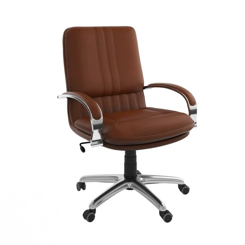 Assise et dossier rembourrés en mousse souple avec couche de dacron. Revêtement en simili cuir ou tissu. Accoudoirs fixe en métal chromé avec une partie rembourré, tapissé. Mécanisme tournant, roulant, réglable en hauteur et en inclinaison. Structure étoilée à 05 branches en métal couleur chromé avec 05 roulettes tournantes roulantes à double galets même matière.