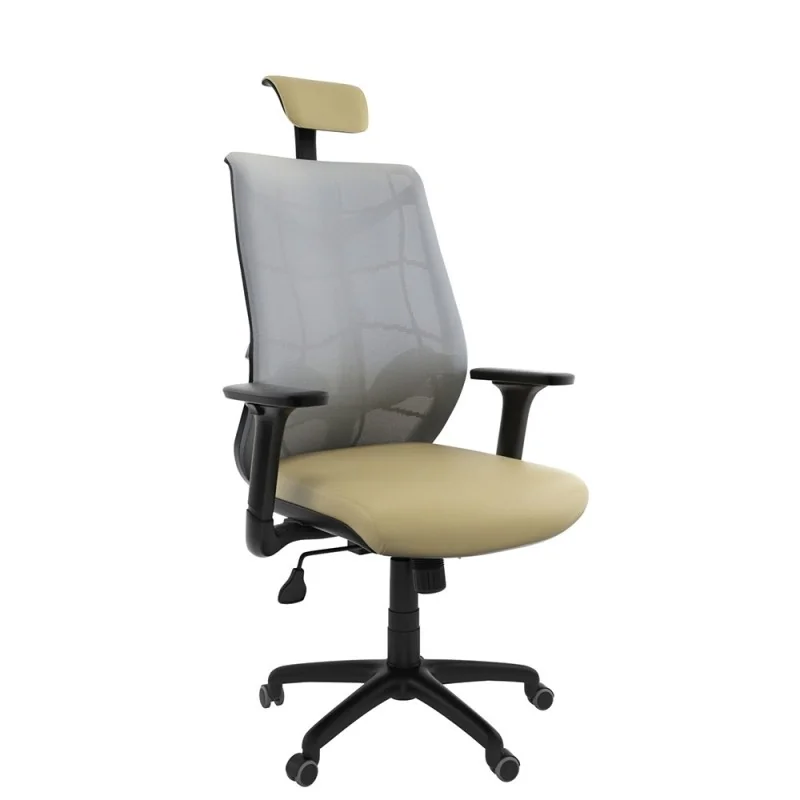 Assise rembourré en mousse souple avec couche de dacron. Dossier en Filet monté sur structure en polypropylène noir avec réglage lombaire en hauteur. Repose tête rembourrés en mousse souple réglable en hauteur. Revêtement en simili cuir. Accoudoirs en polypropylène ajustable et réglable 3D. Mécanisme Synchronique tournant, roulant, réglable en hauteur et en inclinaison. Structure étoilée à 05 branches en métal chromé avec 05 roulettes tournantes roulantes à double galets.