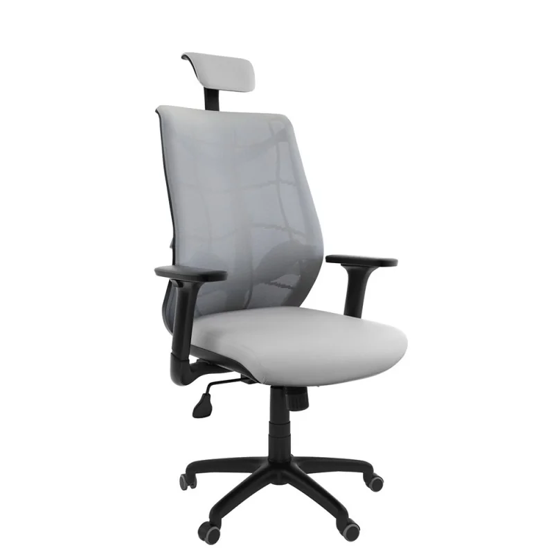 Assise rembourré en mousse souple avec couche de dacron. Dossier en Filet monté sur structure en polypropylène noir avec réglage lombaire en hauteur. Repose tête rembourrés en mousse souple réglable en hauteur. Revêtement en simili cuir. Accoudoirs en polypropylène ajustable et réglable 3D. Mécanisme Synchronique tournant, roulant, réglable en hauteur et en inclinaison. Structure étoilée à 05 branches en métal chromé avec 05 roulettes tournantes roulantes à double galets.
