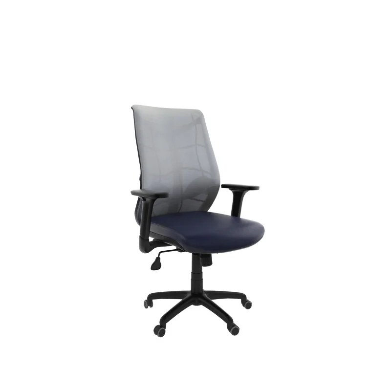 Assise rembourré en mousse souple avec couche de dacron. Dossier en Filet monté sur structure en polypropylène noir avec réglage lombaire en hauteur. Revêtement en simili cuir. Accoudoirs en polypropylène ajustable et réglable 3D. Mécanisme Synchronique tournant, roulant, réglable en hauteur et en inclinaison. Structure étoilée à 05 branches en métal chromé avec 05 roulettes tournantes roulantes à double galets.