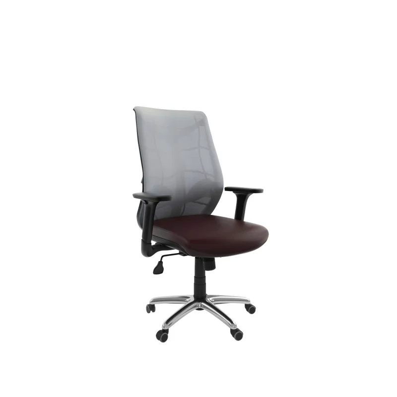 Assise rembourré en mousse souple avec couche de dacron. Dossier en Filet monté sur structure en polypropylène noir avec réglage lombaire en hauteur. Revêtement en simili cuir. Accoudoirs en polypropylène ajustable et réglable 3D. Mécanisme Synchronique tournant, roulant, réglable en hauteur et en inclinaison. Structure étoilée à 05 branches en métal chromé avec 05 roulettes tournantes roulantes à double galets.