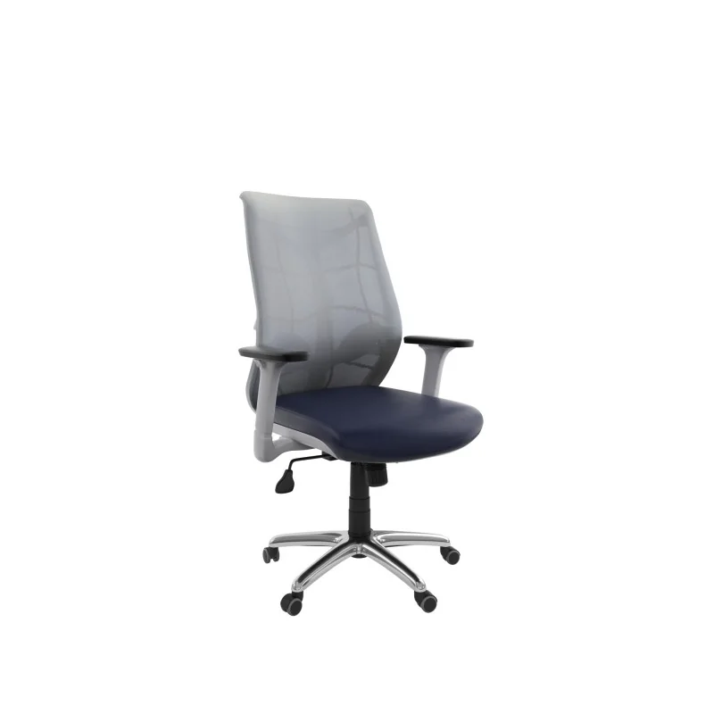 Assise rembourré en mousse souple avec couche de dacron. Dossier en Filet monté sur structure en polypropylène noir avec réglage lombaire en hauteur. Revêtement en simili cuir. Accoudoirs en polypropylène ajustable et réglable 3D. Mécanisme Synchronique tournant, roulant, réglable en hauteur et en inclinaison. Structure étoilée à 05 branches en métal chromé avec 05 roulettes tournantes roulantes à double galets.
