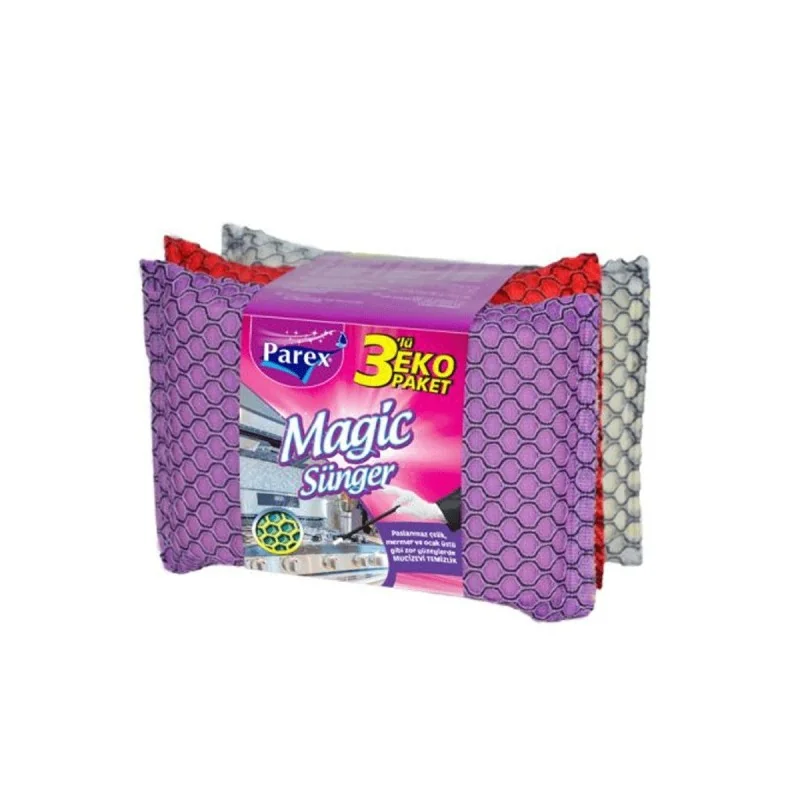 Set de 3 éponges magiques Parex : En fibre, elles offrent un pouvoir de récurage supplémentaire, idéal pour surfaces délicates. Leur texture solide élimine efficacement les saletés tenaces comme sur les casseroles en inox, les poêles et les cuisinières. Disponibles en plusieurs couleurs.