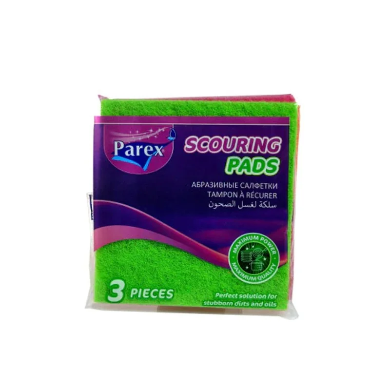 Ensemble de trois tampons grattants Parex en polyester, mesurant 13x14 cm chacun. Ils sont fabriqués avec un feutre grattant de haute qualité qui nettoie efficacement les saletés et les taches tenaces sans endommager les surfaces. Ces tampons sont durables et disponibles en lot de trois, dans plusieurs couleurs.