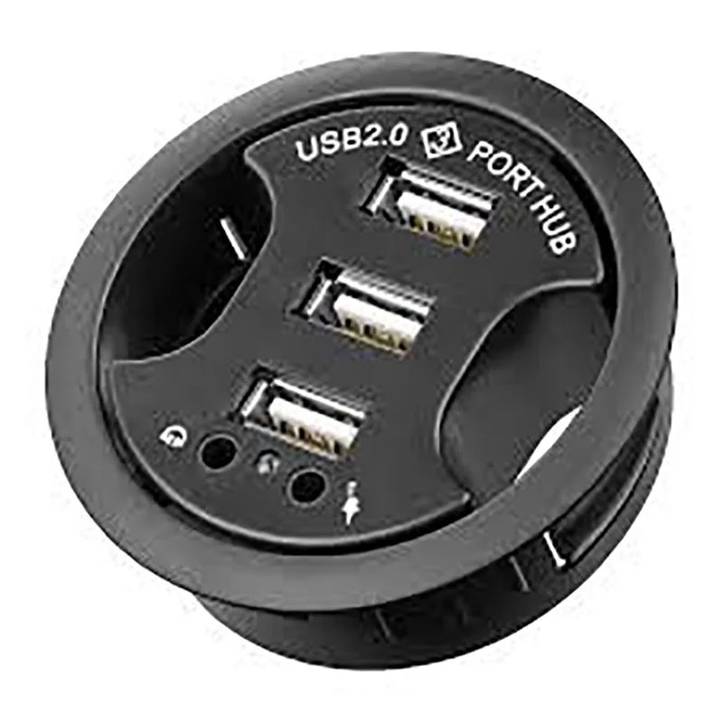 Prise de bureau avec hub 03 portes USB 2.0, diamètre 60, en plastique, avec 2 lecteurs de cartes et ports audio.