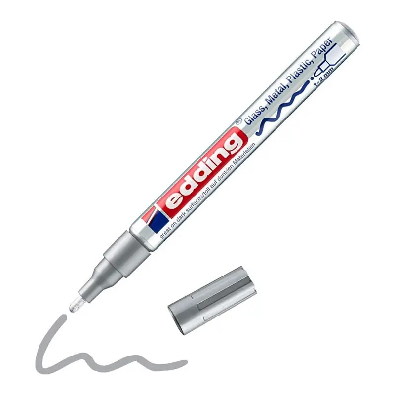 Marqueur peinture Silver à encre laquée, idéal pour écrire et décorer de manière très couvrante. Permanent, il résiste à l’effacement sur surfaces lisses, même foncées ou transparentes : verre, métal, plastique, papier couché. Pointe ogive 1 à 2 mm, faible odeur, sans toluène/xylène, corps aluminium.
